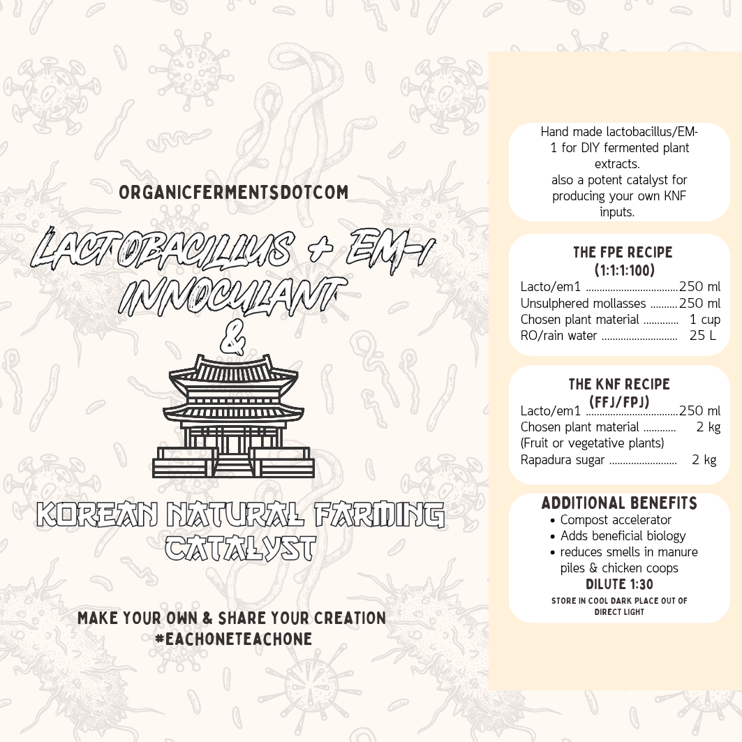 Combining beneficial Lactobacillus and EM-1 (Effective Microorganisms), this blend was created as a base to accelerate fermentation for DIY Fermented Plant Extracts (FPE) its also a perfect catalyst for KNF inputs, compost teas, and overall soil enrichment.